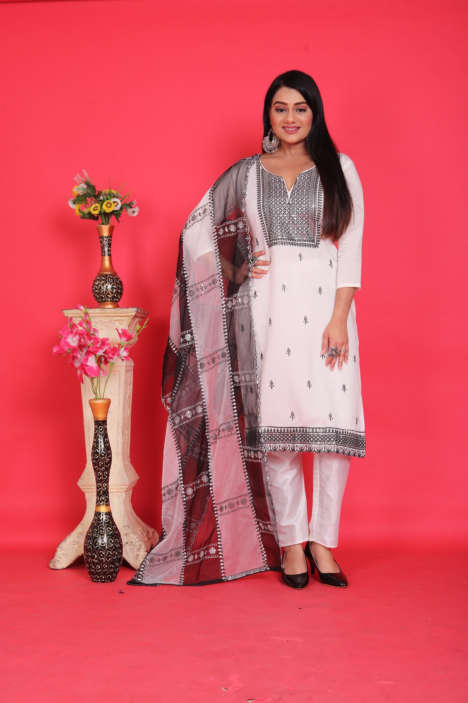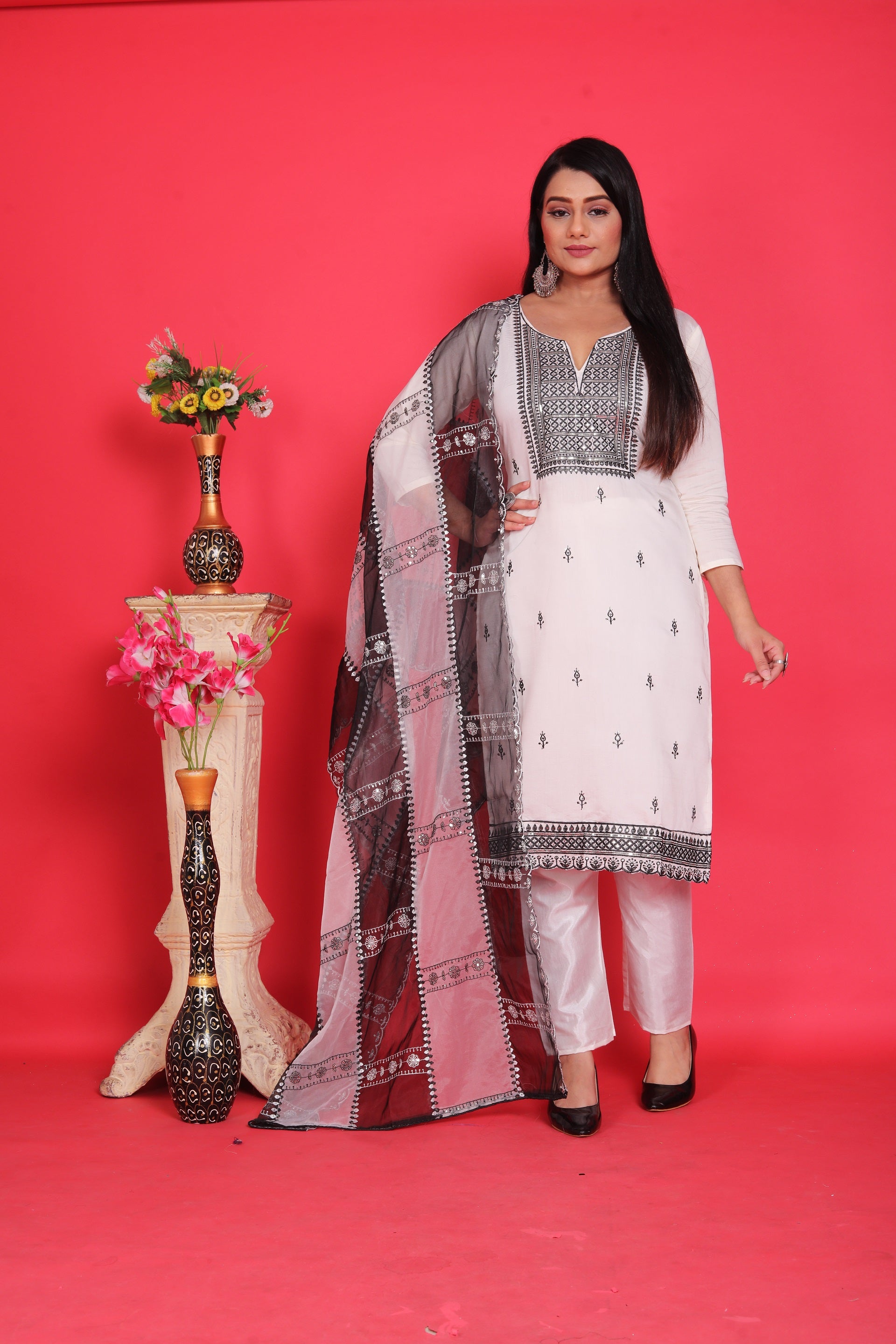 White Roman Silk Women Designer Suit With Heavy Thread Work