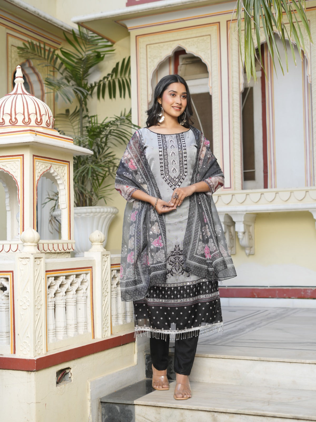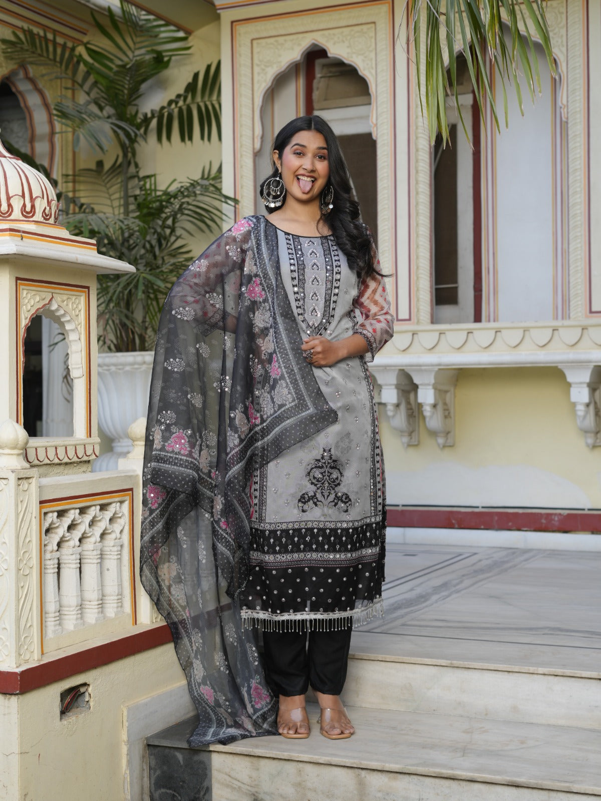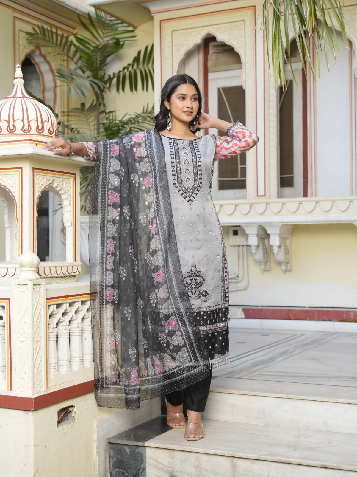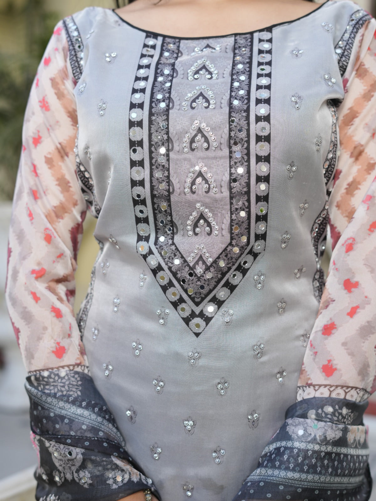 Heavy Organza Gray Pakistani Digital Printed Unstitched Suit With Inner